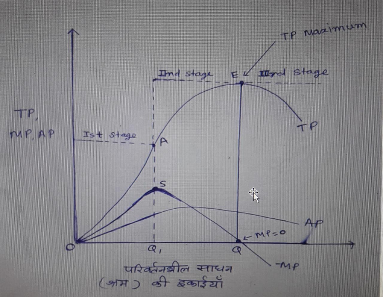 - बिंदु Q पर MP = 0 हो जाती है तो इस स्थिति में TP अधिकतम हो जाती है |