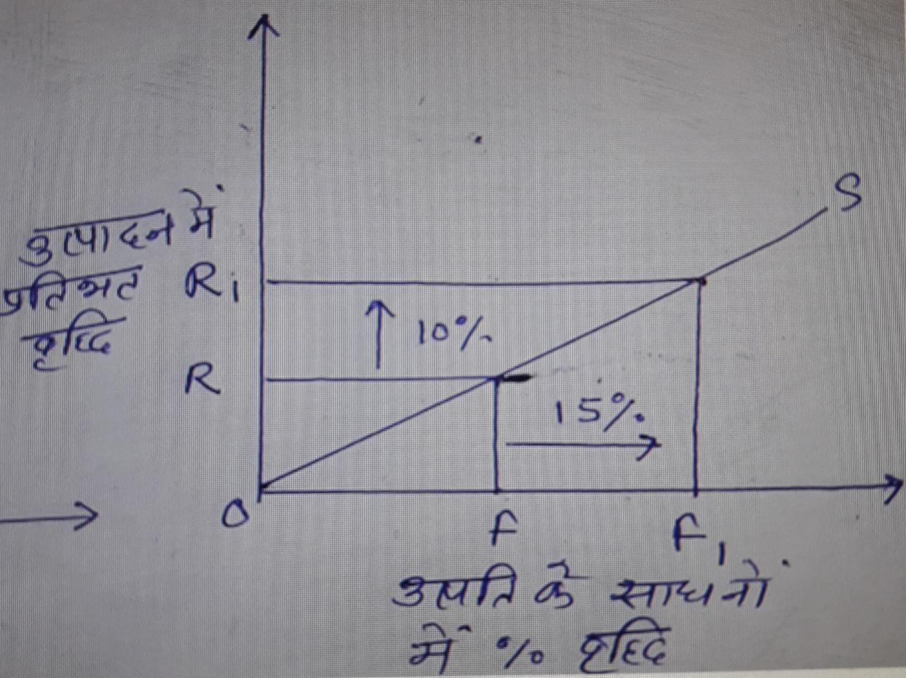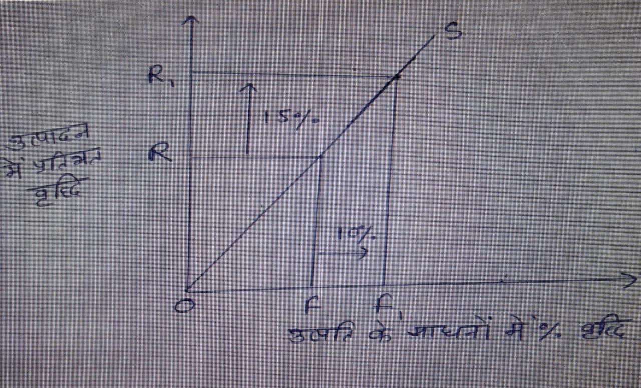 रेखा चित्र से स्पष्ट है कि जब उत्पत्ति के साधनों में 10 % की वृद्धि की जाती है तो उत्पादन में 15 % की बृद्धि हो जाती है जो बढ़ते प्रतिफल की दशा को एस्पष्ट करती है |